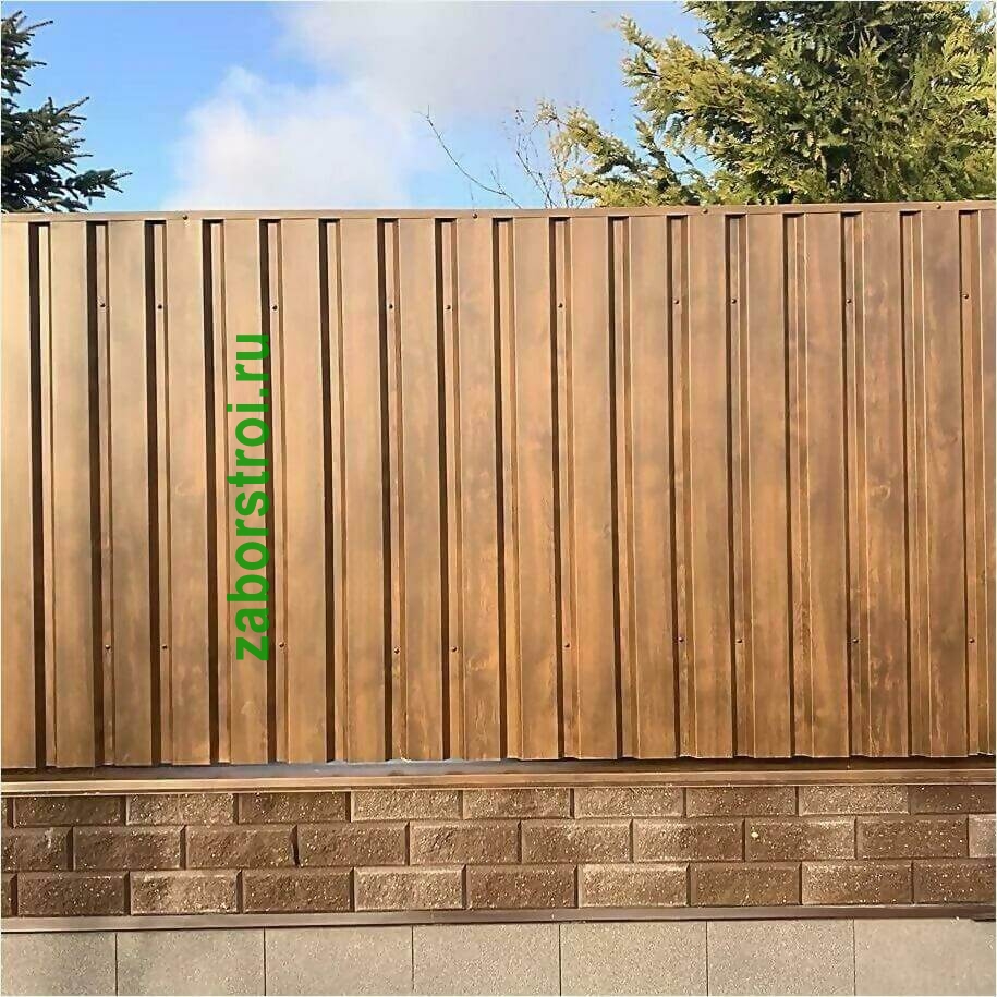 При монтаже ограждения используется на выбор профнастил марок С8, С20, С21 с разной высотой волны и толщиной оцинкованного стального листа от 0.4 до 0.5 мм. Цвет можно выбрать по таблице RAL одностороннего или двустороннего окраса.