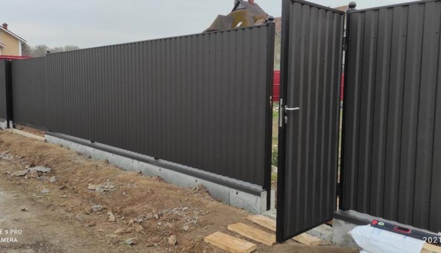 При монтаже ограждения используется на выбор профнастил марок С8, С20, С21 с разной высотой волны и толщиной оцинкованного стального листа от 0.4 до 0.5 мм. Цвет можно выбрать по таблице RAL одностороннего или двустороннего окраса.